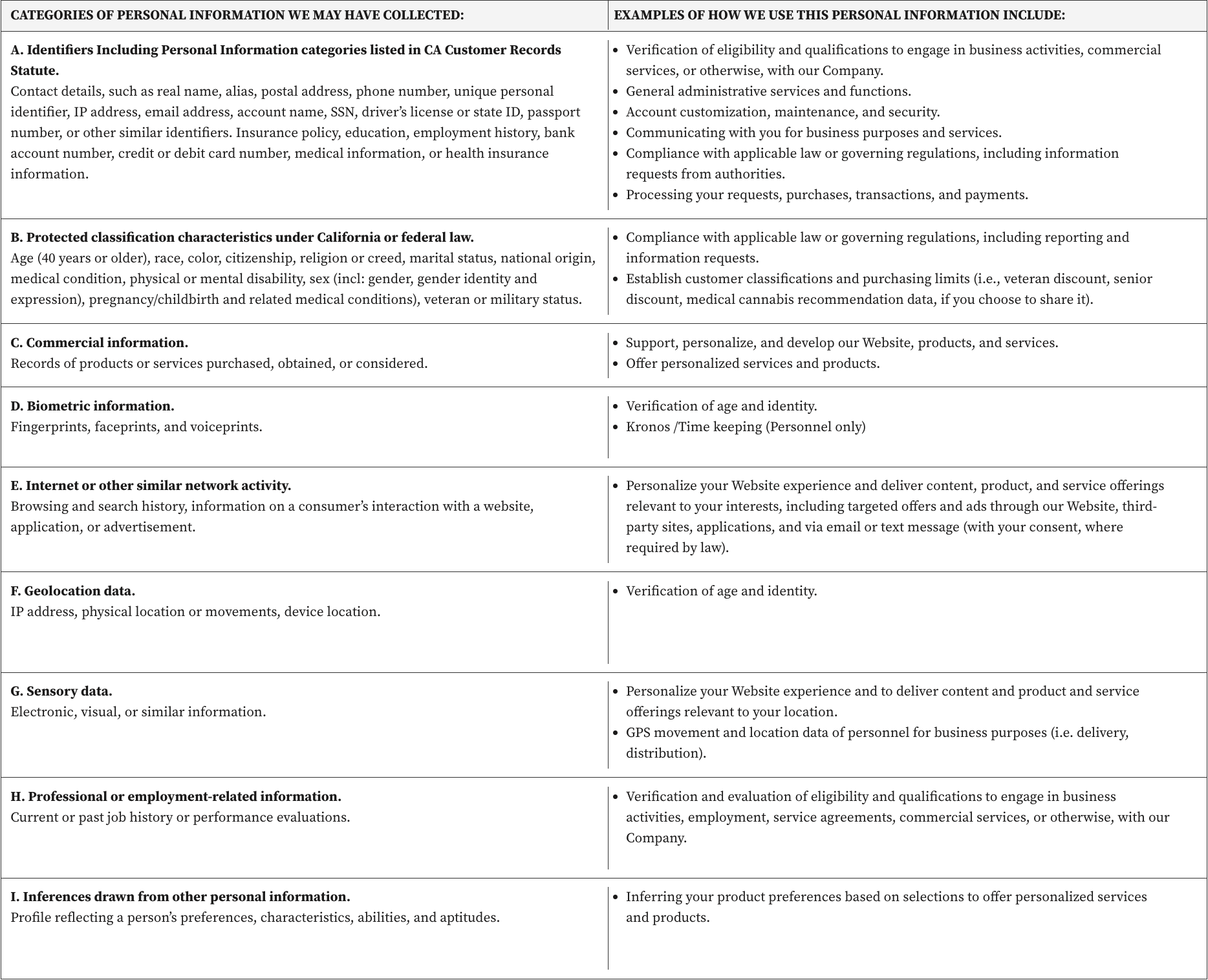 In particular, We may have collected the following categories of personal information from consumers, including job applicants and employees, within the last twelve (12) months for business and commercial purposes. See below for additional information on how information is collected, the purpose of collection, and how personal information is used and shared.