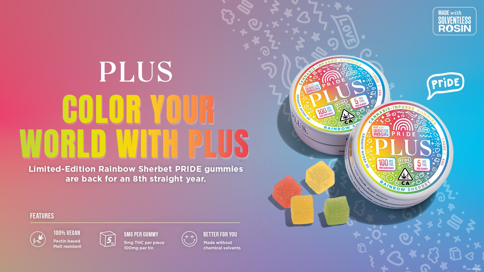 Our Limited-Edition PLUS Pride gummies are back and better than ever. The delicious and sweet Rainbow Sherbet flavor you know and love, now made with solventless rosin and 100% vegan. Each gummy is infused with 5mg of uplifting THC, crafted to bring us together to spread love and joy.