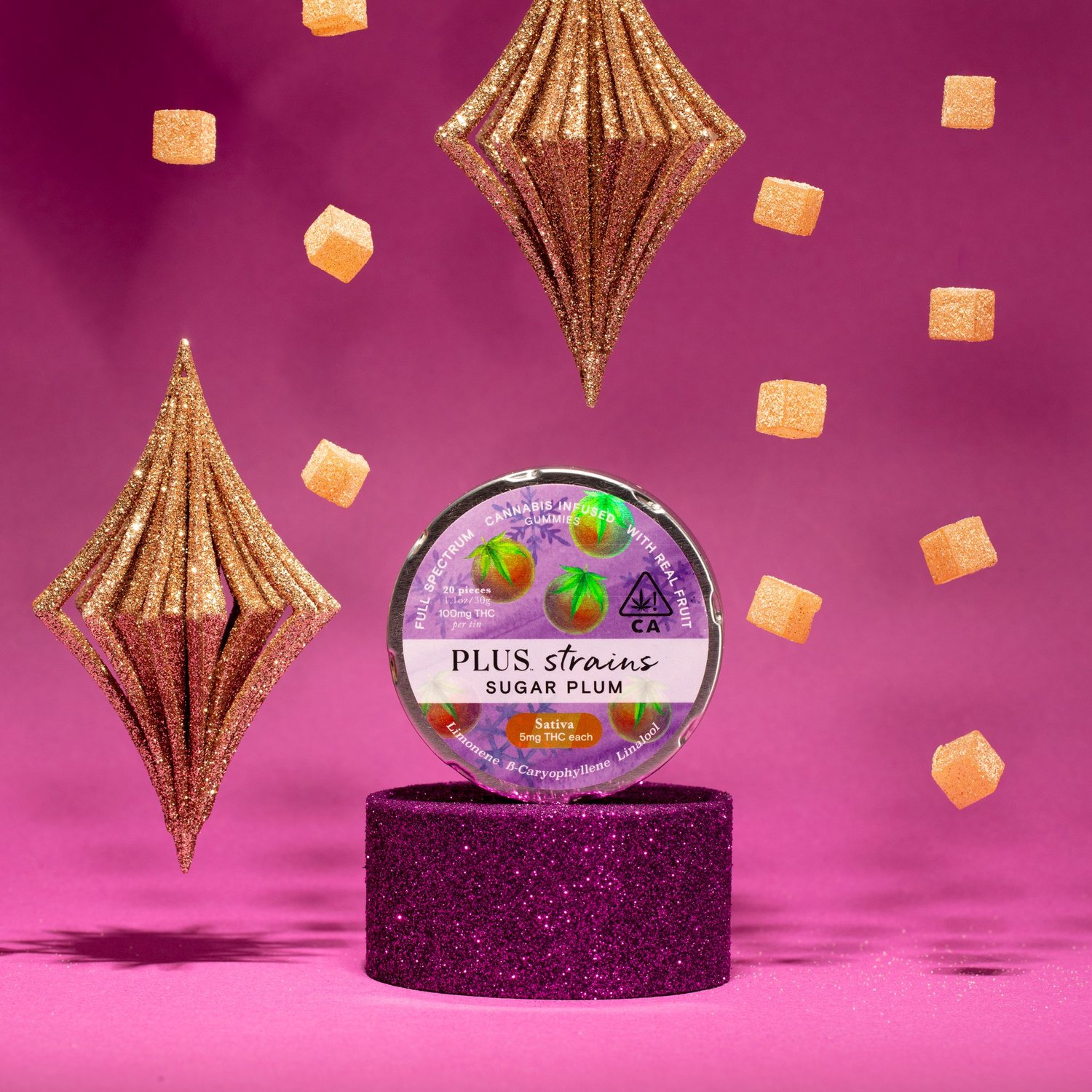 Gifted from the greats, Berkley Blues and Hawaiian Haze Plum, this special sativa Sugar Plum strain presents a magical mix of linalool, limonene and b-caryophyllene terpenes to lift your spirits and bring joy to your world. A delightful dance of sweet and spice (or naughty and nice), we blend blood orange citrus and toasted cinnamon notes for a fun, festive flavor. And each Sugar Plum gummy is sprinkled with sparkle to spread holiday cheer with every bite, while visions of sugar plums dance in your head.